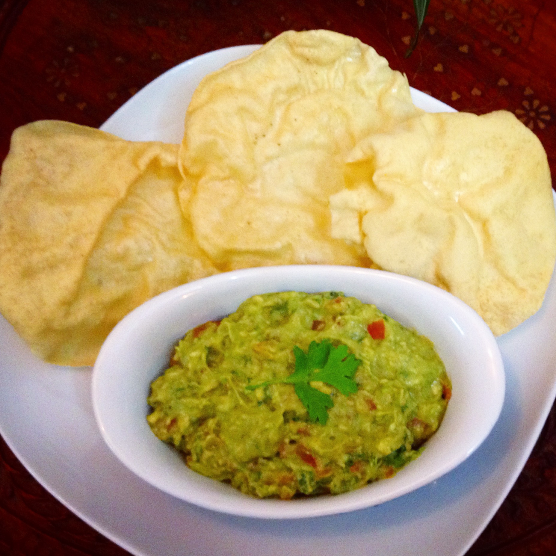 I usually have it with crisps or nacho chips but I didn’t have either at home and so I served it with fried crunchy papadams (and I recommend you try it!).