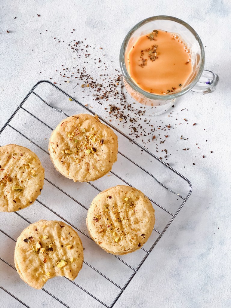 I had my first cup of saffron chai in Dubai. The flavor and smell of saffron enhances the spices of chai, and I knew I had to experiment more with it. This cookie recipe brings these flavours together, topped off with pistachios to add the finishing touch.Ingredients